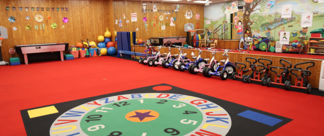 A 1,100 square foot, mirrored movement room for gymnastics, tumbling, and motor activities. This is always a favorite spot for our young learners. During inclement weather, the gym can also be used as a fun indoor play area.